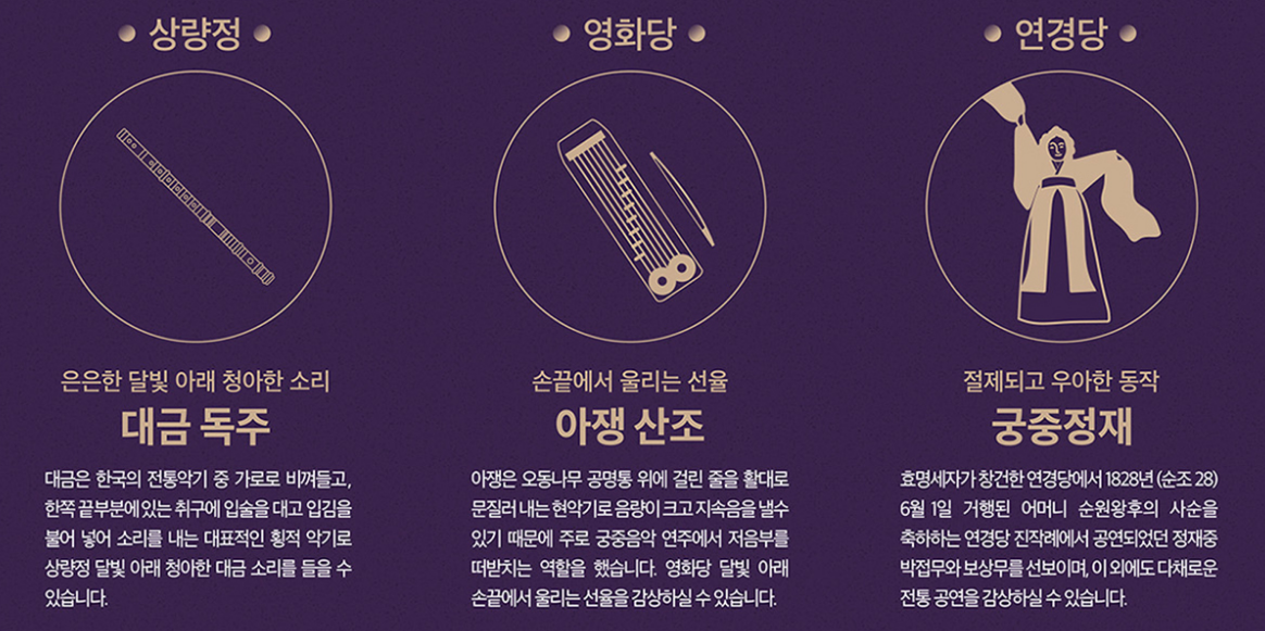 - 아쟁 산조 : 영화당에서 펼쳐지는 아쟁 산조 공연입니다. 저음 악기의 매력을 느껴보실 수 있습니다.