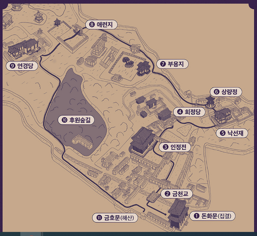 창덕궁의 아름다운 밤길을 걸으면서 이색적인 야경을 감상하는 것으로 마무리되는 코스입니다. 창덕궁의 아름다움을 깊이 느끼는 시간이 되시길 바랍니다.